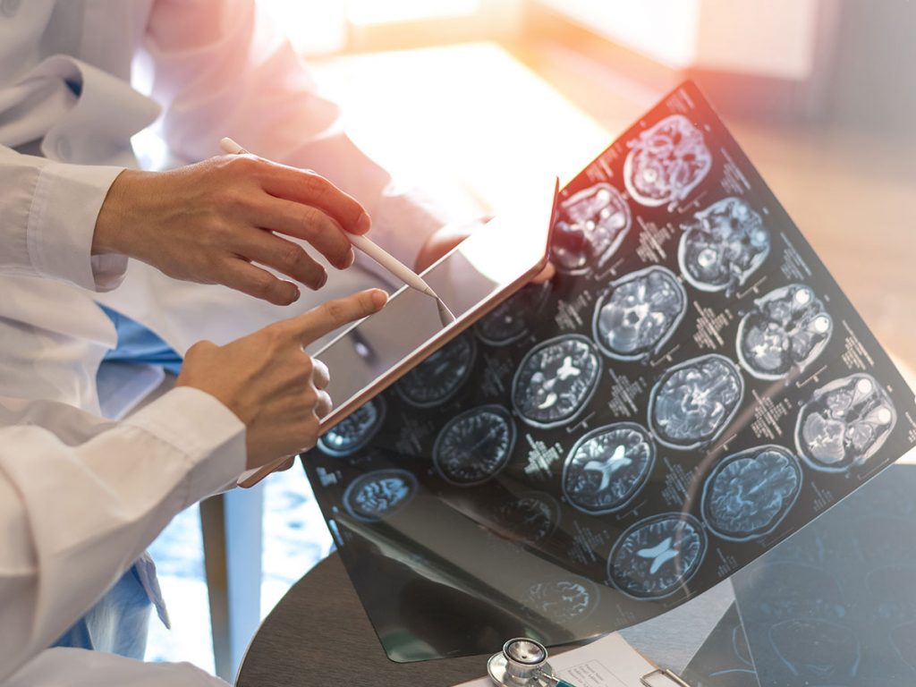 Wir kooperieren eng mit radiologischen Einrichtungen zur Durchführung ausgewählter bildgebender Verfahren wie Computertomographie (CT) und Magnetresonanztomographie (MRT) von Gehirn, Rückenmark und hirnversorgender Arterien.
